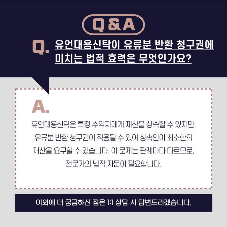 유언대용신탁이 주는 편리함에도 불구하고, 유류분 반환 청구권에 관한 문제는 여전히 존재합니다. 유류분 반환 청구권은 법이 상속인에게 최소한의 상속 재산을 보장하기 위해 규정한 권리로, 이는 유언대용신탁에서도 적용될 수 있습니다. 즉, 신탁을 통해 재산을 특정인에게 상속하려고 해도, 다른 상속인들은 법정 유류분을 요구할 권리가 있는 것입니다.