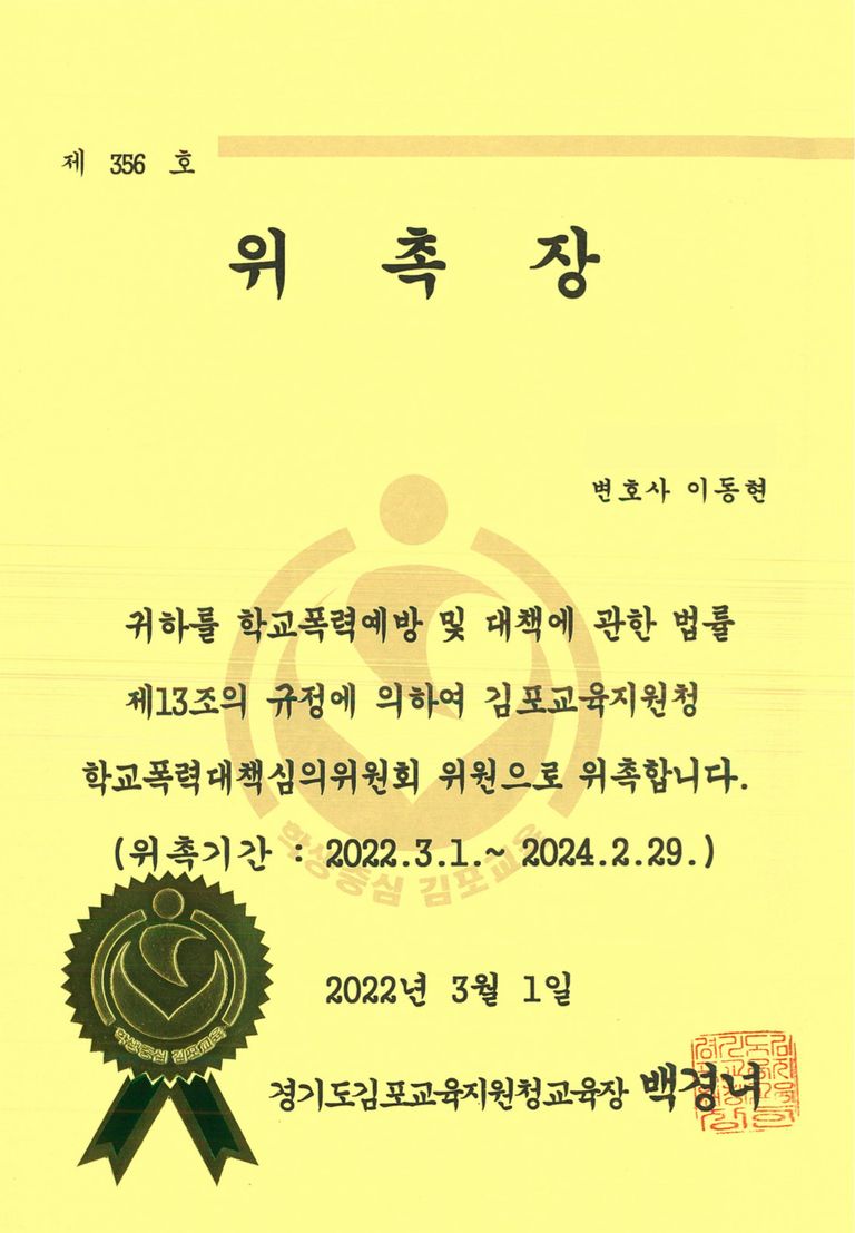 저는 현재 학교폭력대책심의위원회 위원장, 위원으로 활동하고 있을 뿐만 아니라 서울시교육청 행정심판위원회 위원으로도 활동하고 있습니다. 이는 판단자의 입장을 경험함으로써 각 사안에 맞춰 학폭위에서 적절한 대응을 할 수 있는 강점이 있습니다.