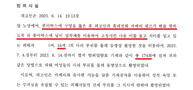 A씨는 2023. 6. 14. 19:13경 종이박스에 구멍을 뚫은 후 휴대전화 카메라 렌즈가 밖을 향하도록 접착제를 이용하여 고정시킨 다음 들고다니며 16세 B양을 뒤쫓아가 다리 부위를 촬영하다가 현행범 체포되어 조사를 받게 되었습니다.