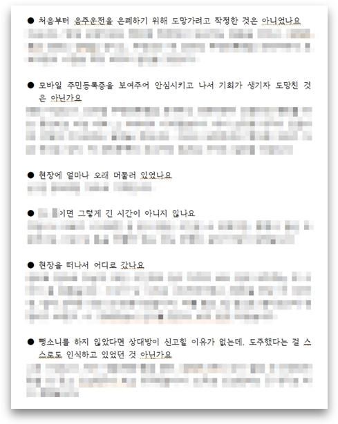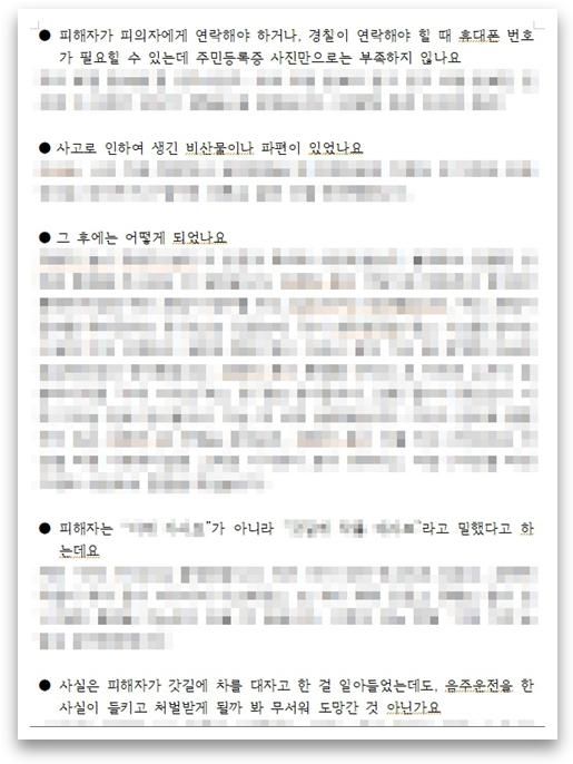 음주운전 부분은 인정하고 계시고, 실형만 피한다면 집행유예까지 나오더라도 충분히 감수할 수 있다고 하시기에, 그렇다면 경찰/검찰 단계에서 도주치상 혐의만 벗겨드린다면 그 이후에는 국선변호사의 도움을 받거나 혹은 혼자서 양형 변론을 하실 수 있을 것이라고 판단하였습니다. 그래서 수사 단계에 있어서 가장 중요하다고 할 수 있는 경찰 피의자신문에 있어서만 부분적으로 도움을 받으실 것을 권해드렸고, 그렇게 계약을 체결하게 되었습니다. 또한 경찰에서는 진술서를 이미 받았으니 피의자신문을 생략하고 바로 송치하겠다고 말하는 상황이어서, 수정된 내용의 피의자 진술서를 제출하고 정식 조사를 촉구할 필요도 있어서 이 부분도 같이 조력해 드렸습니다.