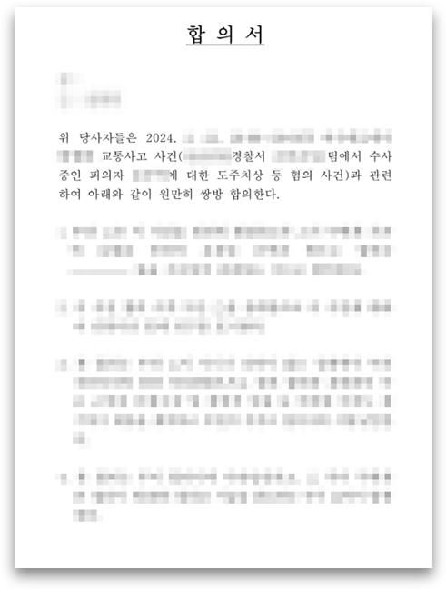 또한, 뺑소니 부분의 누명이 벗겨지더라도 여전히 음주운전 교통사고 사건이고, 차량의 비산물 등이 있을 경우 사고후미조치죄도 추가로 성립할 수 있기 때문에 피해자와의 합의가 중요했습니다. 다행히 피해자 분께서도 대화가 잘 통하는 분이셔서, 서로 이런 부분이 오해였던 것 같다고 정중히 말씀드리고 원만한 합의를 진행하였습니다. 또한 피해자 분께 의뢰인 분의 어려운 사정에 대하여도 따로 말씀드리고 양해를 구해, 상해진단서가 제출되지 않고 지나간다면 의뢰인 분께 큰 힘이 될 것이라는 점도 간곡히 말씀드렸습니다.