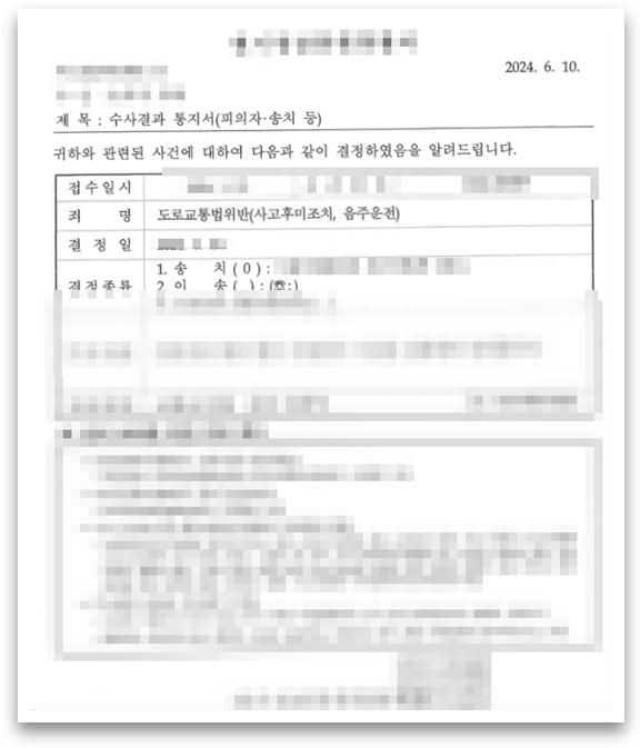 원래는 교통사고처리특례법위반, 도주치상, 사고후미조치, 음주운전까지 해서 수사를 받던 중범죄 건이(만일 이 죄명이 다 인정된다면 정말 실형이 나올 수 있는 건이었습니다), 사고후미조치만 음주운전만 해서 벌금형으로 처리되었습니다! 실형을 피하는 것이 목표였는데, 아예 구공판조차 되지 않고 구약식으로 끝나게 되어 정말 다행이었습니다.