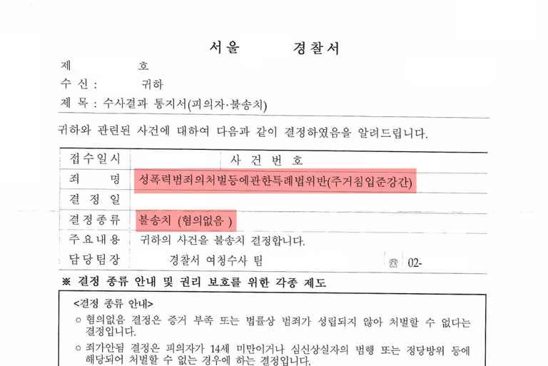 그 결과, 주거침입 및 준강간 혐의에 대해 무혐의(혐의없음) 처분을 받았습니다.