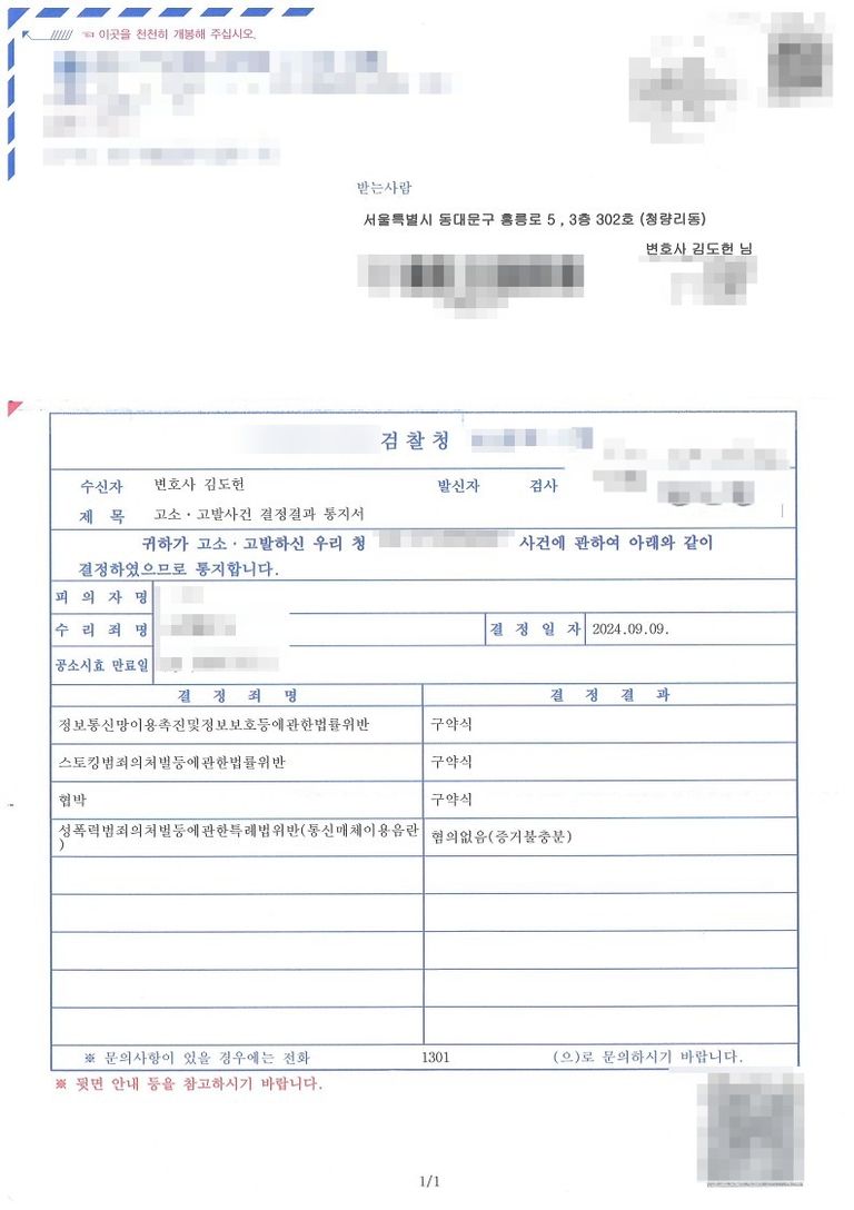 김도헌 변호사는 일단 고소를 함과 동시에 접근금지명령 등을 통하여 추가적인 피해를 저지하도록 노력하였고, 결국 상대방에게 벌금형의 약식명령이 결정되었습니다.