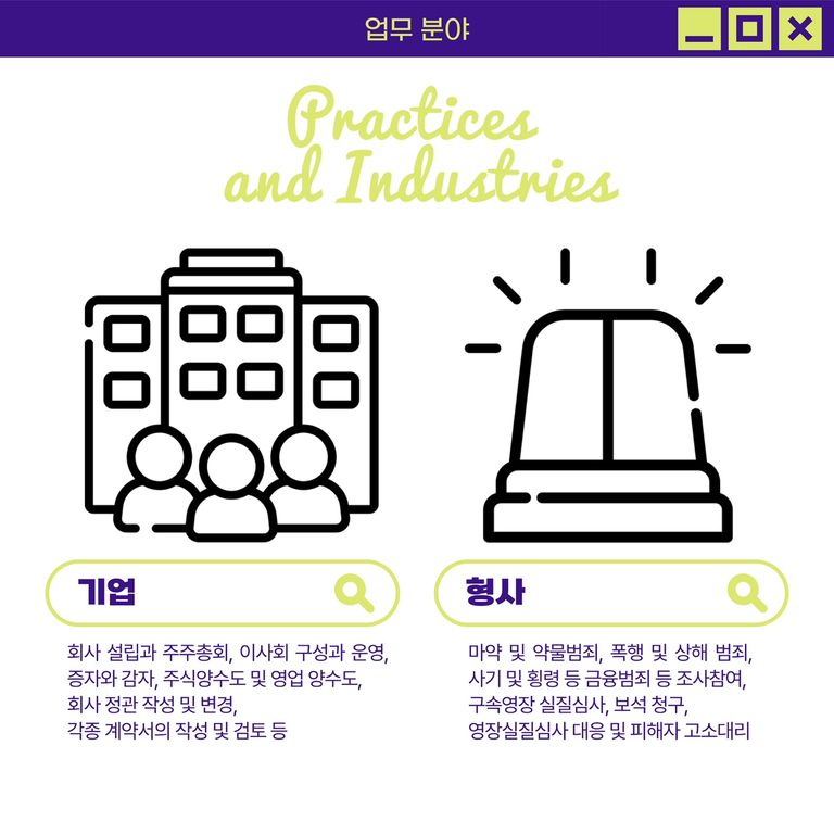 저희 법률사무소의 구체적인 업무분야는 아래와 같습니다. 하지만.. 개업변이 뭘 가리고 그러진 않습니다. ㅎㅎ 그냥 다 합니다. 의뢰들어오는 대로 성실하게 업무에 임하고 있습니다.