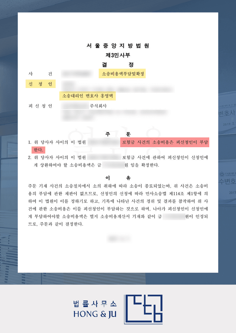 이에 법률사무소 디딤의 홍영택 안산변호사는 법원으로부터 소송비용을 보험사가 부담하라는 결정까지 받아냈습니다.