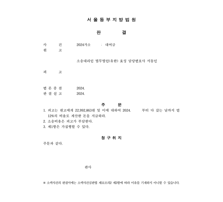 저는 즉각 대여금청구소송을 제기하여 기타 증거로 대여사실을 주장 입증하였고 법원은 원고 승소 판결을 선고하여 의뢰인은 대여금을 변제받았습니다.
