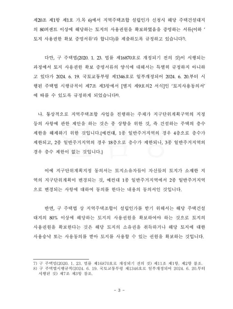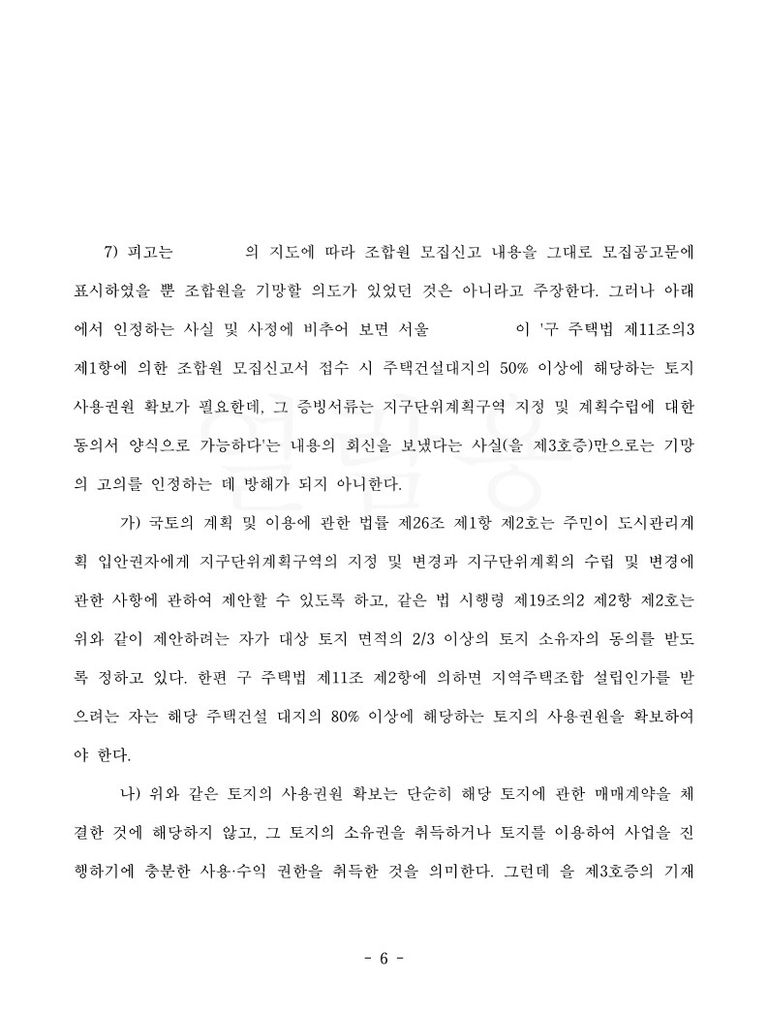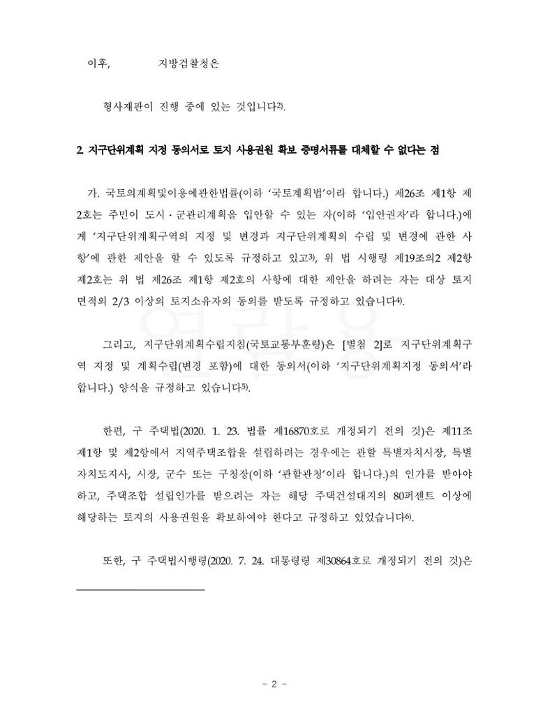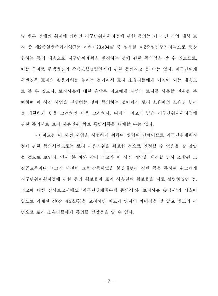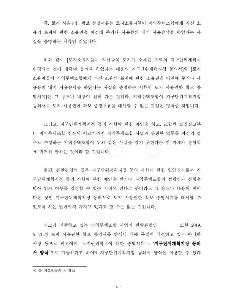 이에 원고 소송대리인은 [토지소유자들이 ‘자신들의 토지가 소재한 지역의 지구단위계획이 변경되는 것에 대하여 동의를 하였다는 내용의 지구단위계획지정 동의서’와 토지소유자들이 지역주택조합에게 ‘자신 소유의 토지에 관한 소유권을 이전해 주거나 사용동의 내지 사용승낙을 하였다는 사실을 증명하는 서류인 토지 사용권한 확보 증명서류’는 그 용도나 내용이 전혀 다른 것인바, 지역주택조합이 지구단위계획지정 동의서로 토지 사용권한 확보 증명서류를 대체할 수 없는 것임은 명백한 것으로 피고의 주장은 이유 없다]는 취지의 주장을 하였습니다.