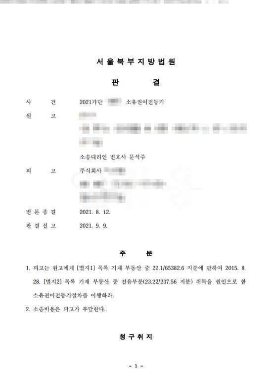 청산완료된 분양회사에 대해서도 건물 대지의 소유권을 취득하지 못한 전유부분 소유자에게 소유권 이전등기를 넘겨줄 수 있다는 저희 법률사무소의 주장을 받아들여 법원은 상가 대지권 지분에 관하여 소유권을 이전하라는 판결을 선고하였고 의뢰인은 법원의 판결문으로 대지권을 등기하여 의뢰인의 정당한 재산권을 회복할 수 있었습니다.
