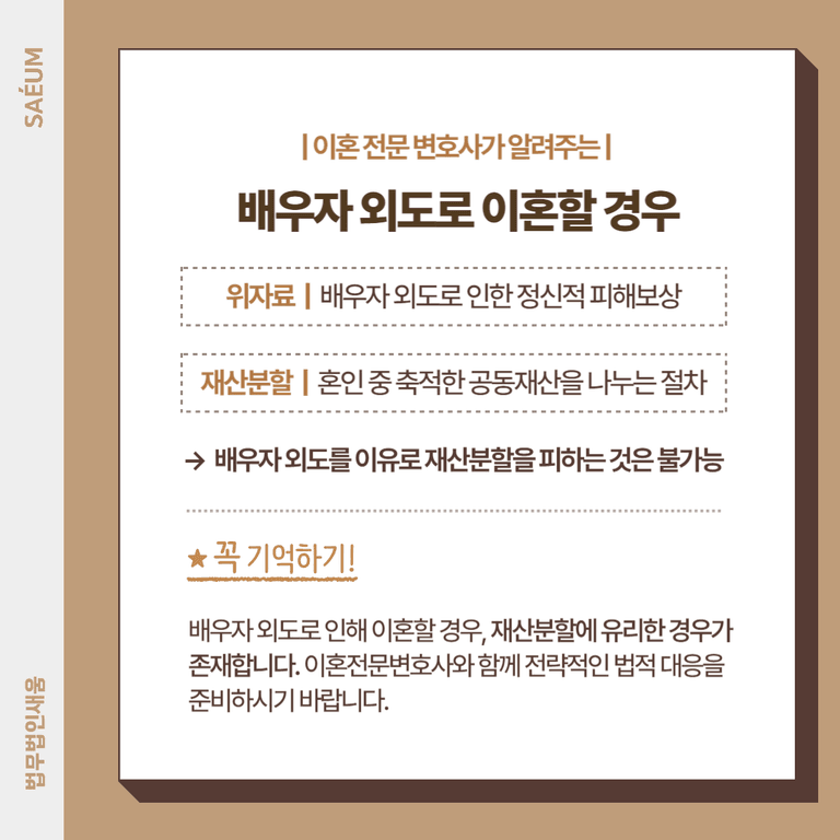 재산분할 비율을 조정하거나, 배우자의 외도로 인한 경제적 피해를 입증해 최대한의 보상을 받을 수 있도록 철저한 법적 대응을 준비하는 것이 중요합니다.