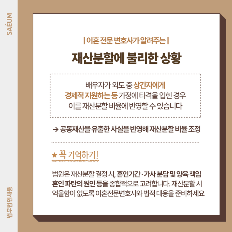 법원은 재산분할을 결정할 때 혼인 기간, 가사 분담 및 양육 책임, 그리고 혼인 파탄의 원인 등을 종합적으로 고려합니다. 만일 배우자가 외도 중 공동 재산을 유출한 사실이 있다면, 이를 충분히 반영해 재산 분할 비율을 조정할 수 있습니다. 이때 이혼 전문 변호사와 함께 법적 대응을 준비해 불이익을 방지하는 것이 중요합니다.