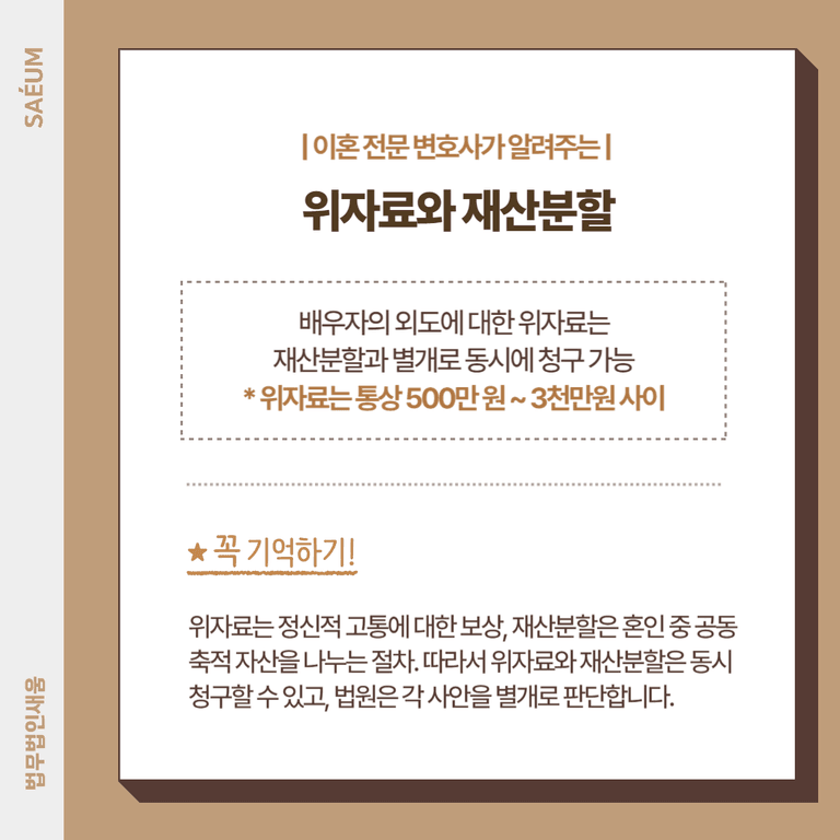 위자료는 통상 500만 원에서 3,000만 원 사이로 청구되며, 상황에 따라 다릅니다. 위자료와 재산분할 모두에서 최대한의 보상을 받기 위해서는 적절한 증거와 법률적 조언이 필요합니다.