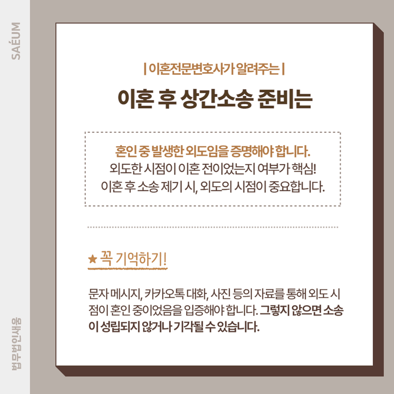 상간소송에서 중요한 것은 배우자와 상간자가 혼인 기간 중에 부적절한 관계를 유지했다는 사실을 증명하는 것입니다. 특히 이혼 후에 소송을 제기하는 경우에는 시점이 매우 중요합니다. 배우자와 상간자가 부적절한 관계를 유지한 시점이 이혼 전이었는지 여부가 핵심입니다. 이혼 후에 발생한 외도는 혼인 파탄과 직접적인 관련이 없기 때문에 소송 대상이 되지 않을 수 있습니다.