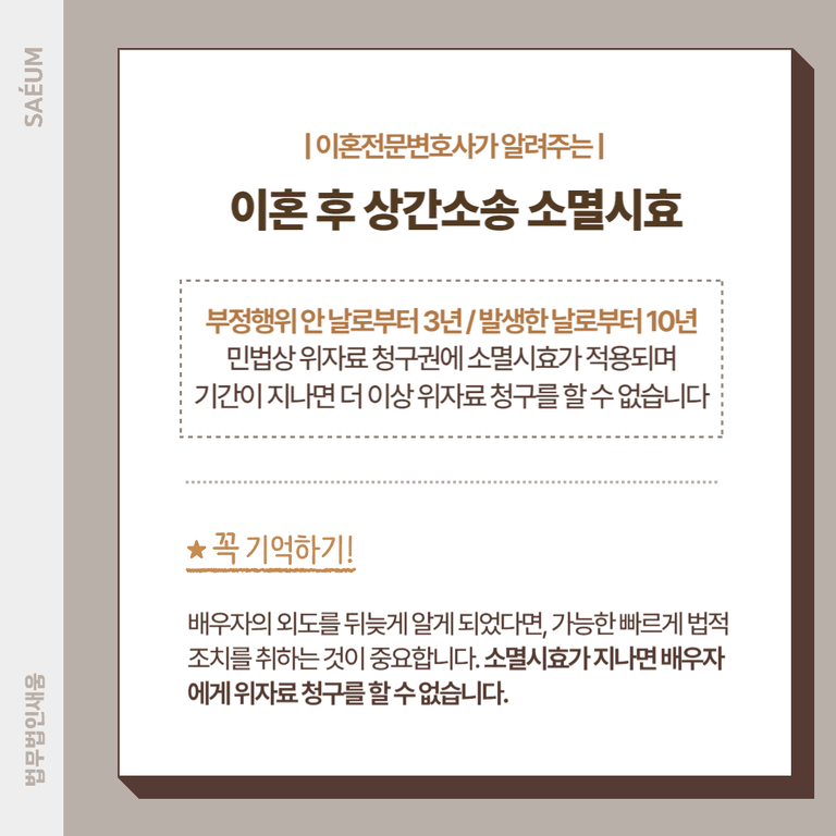 이혼 후 배우자의 외도를 알게 되어 상간소송을 진행할 때는 소멸시효에 주의해야 합니다. 민법상 위자료 청구권에는 소멸시효가 적용되며, 이는 부정 행위를 안 날로부터 3년, 혹은 부정 행위가 발생한 날로부터 10년입니다. 이 기간이 지나면 더 이상 위자료 청구를 할 수 없으므로, 시기를 놓치지 않도록 주의해야 합니다.