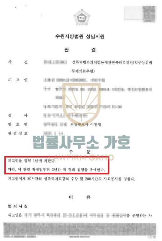 죄질이 좋지 않은 업무상 위력을 이용한 성범죄이고 유죄로 인정될 경우 중한 실형이 예상되는 상황이었는데, 포기하지 않고 끝까지 치열한 법적 공방을 통해 결국 집행유예를 받아 실형을 면하는 엄청난 결과를 맞이한 사건이었습니다.