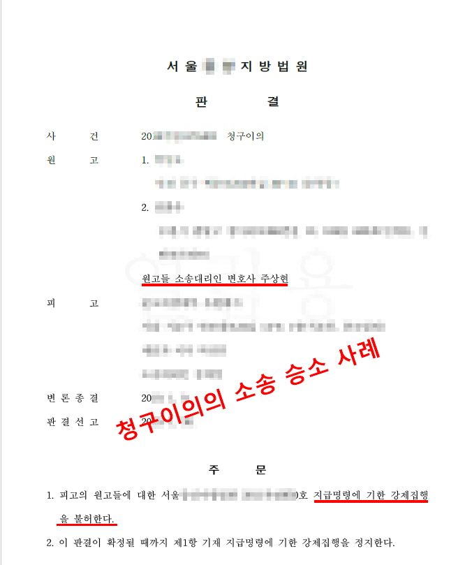 청구이의 소송를 제기하여 지급명령에 기한 강제집행 불허 결정(전부 승소)을 받은 사례입니다.