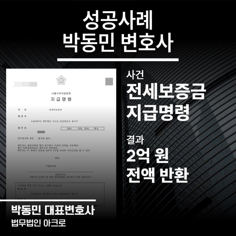 이번 사안은 2억 원이라는 큰 금전임에도 본 변호인의 조력을 받아 2달이라는 짧은 기간 안에 보증금을 반환받은 사례로, 전문변호사의 유무가 결과에 얼마나 큰 영향을 미치는지 여실히 보여주는 사안입니다.
