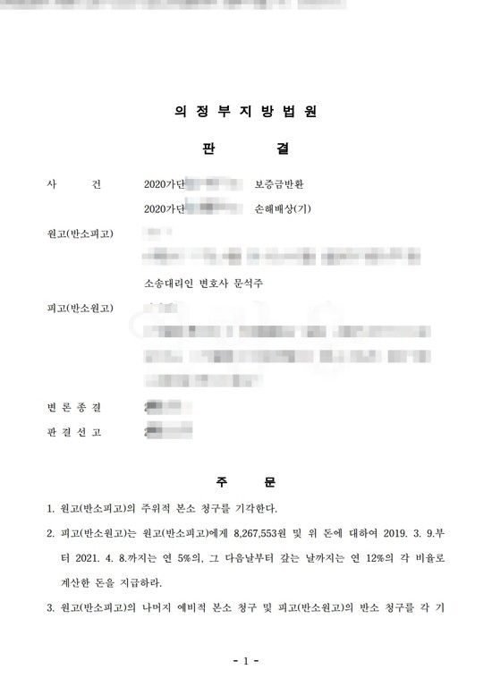본 법률사무소는 임대인이 요구하는 원상회복범위는 통상의 손모에 불과하며 임대인이 주장하는 원상회복비용 역시 지나치게 과다하다고 주장하면서 보증금의 반환을 구하였습니다.