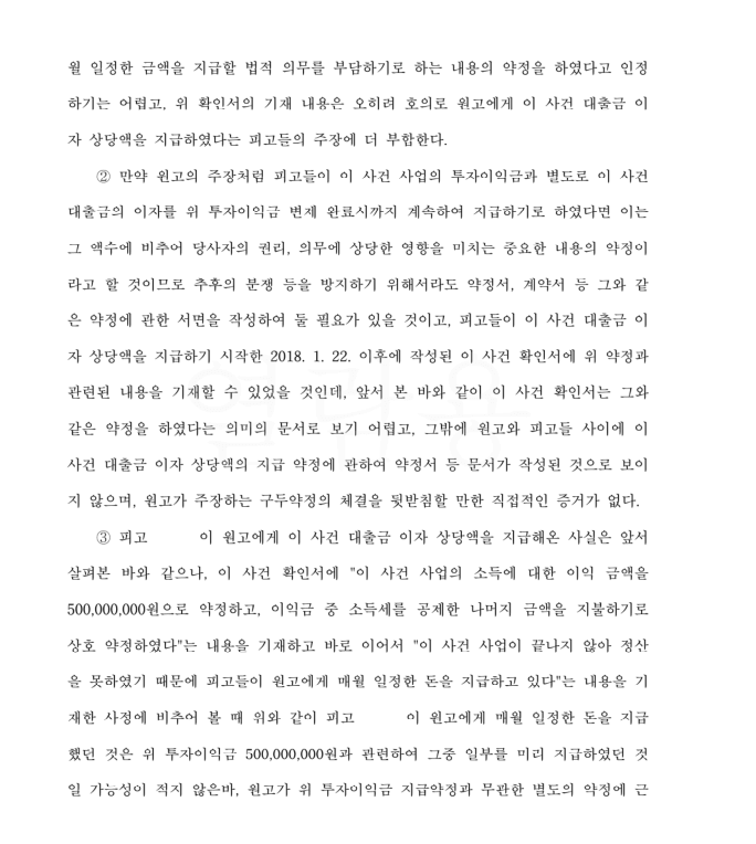 부동산 시행, 임대사업을 하는 의뢰인이 처음 사업을 시작할 때 5억 원을 빌린 사실이 있었습니다. 빌린 5억 원을 모두 변제하였으나 사업의 이익이 발생할 경우 이익금을 지급하겠다는 약정서를 작성해주었고, 이를 근거로 하여 약정금 청구가 들어오게 되었습니다. 의뢰인이 진행한 사업이 완성되었고, 이익이 발생했다면 이에 대한 약정금을 지급할 이유가 되겠지만 해당 사업은 완성이 되지 않았고, 의뢰인은 빌린 5억 원도 모두 변제를 한 상황이기 때문에 상대방의 청구는 부당한 측면이 많았습니다.