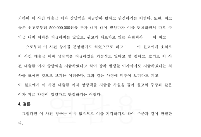 이에 다양한 논리로 상대방의 투자약정금 5억 원 청구에 대응하여 전부 기각시킬 수 있었습니다.