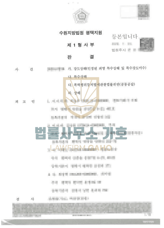 의뢰인은 다른 친구들 3명과 집단으로 피해자가 돈을 갚지 않는다는 이유로 자신의 사무실로 데려가 쇠파이프, 행거봉, 바리깡, 사시미칼 등을 이용하여 전신을 구타하여 돈을 받아낸 강도상해 혐의로 경찰조사를 앞두고 있었습니다. * 수사 및 재판과정에서 특수상해로 죄명변경
