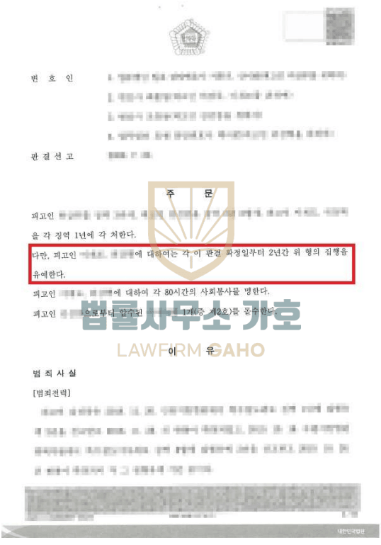 사건초기 구속영장청구까지 되었고 최종적으로 실형이 선고될 가능성이 너무도 높은 상황이었는데, 법리적인 주장을 통해 죄명도 변경되도록 하고 양형사유와 정상참작사유를 끌어모아 선처를 호소하여 결국 실형을 면하게 된 성공적인 사건이었습니다.