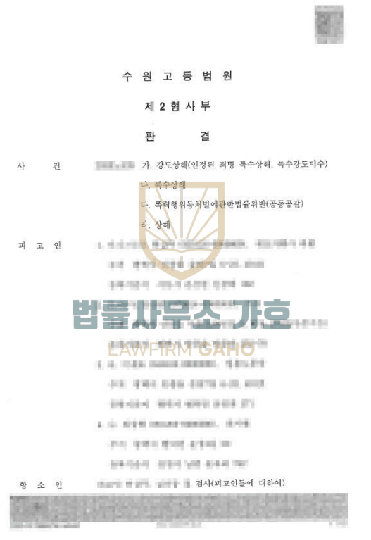 이미 1심에서 가호의 조력으로 집행유예를 받았으나 집단으로 지능저하의 피해자를 상대로 위협하고 폭행하여 돈을 받아냈고 이 과정에서 피해자에게 심각한 상해까지 입힌 강도상해 사건으로 그 죄질과 피해 정도가 상당하여 2심에서 번복될 가능성이 높았던 사안이었기에 항소심 진행간에도 사실관계 분석을 기반으로 법리적 쟁점 주장 및 유사사례 검토를 담은 [변호인의견서]를 제출하는 등 전방위적인 조력을 하였습니다.