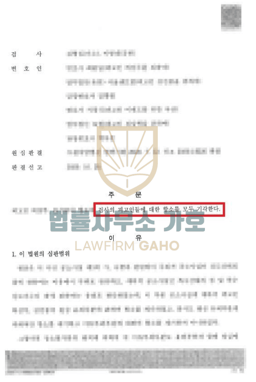 사건초기 구속영장청구까지 되었고 항소심에서 실형으로 번복될 가능성이 높은 상황이었는데, 지속적으로 양형사유와 정상참작사유를 끌어모아 선처를 호소하여 결국 검사항소기각을 받아내어 실형을 면하게 된 성공적인 사건이었습니다.