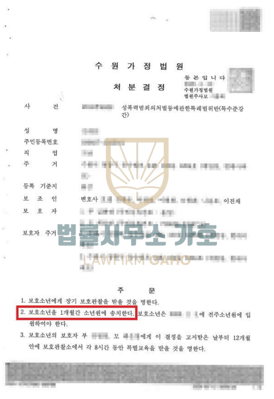 죄질이 좋지 않은 미성년자 상대 집단성범죄이기 때문에 일반 형사재판으로 진행된다면 실형이 예상되는 상황이었는데, 포기하지 않고 끝까지 양형사유 및 정상참작사유를 제출하고 나아가 합의까지 성공하여 결국 일반 형사재판이 아닌 소년재판으로 송치되어 소년보호처분을 받는 엄청난 결과를 맞이한 사건이었습니다.