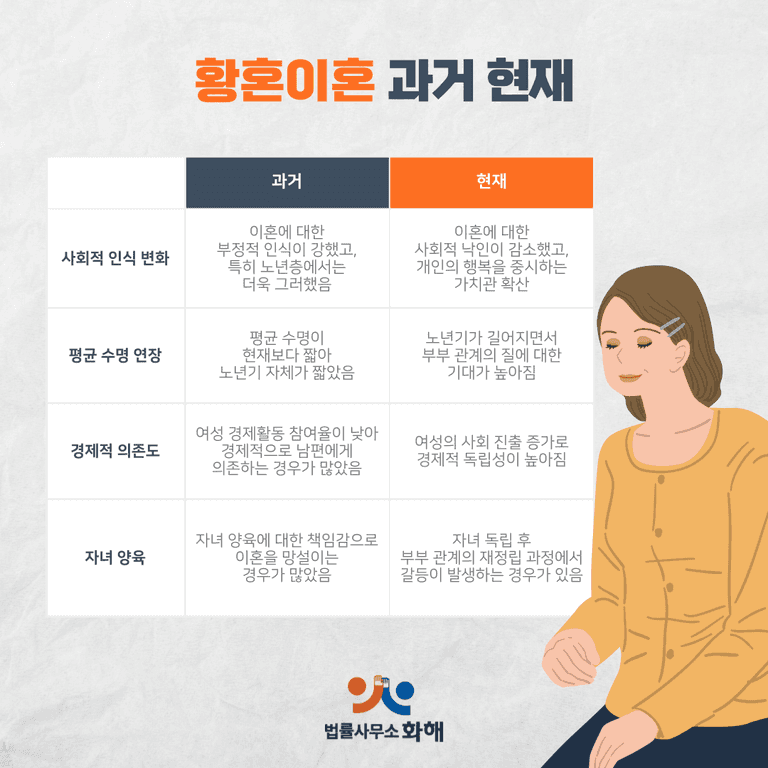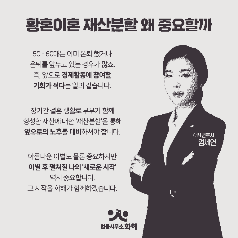 황혼이혼을 준비중이시거나 도움이 필요하신 분들은 언제든 저희 화해로 연락주시기 바랍니다!