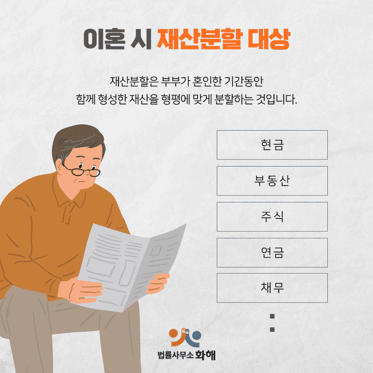 우선, 이혼 시 재산분할은 부부가 혼인 기간 동안 협력해서 함께 형성한 재산을 형평성에 맞게 분할하는 것입니다. 재산분할 대상으로는 현금 · 부동산 · 주식 · 연금 등 모든 자산이 포함되는데요. 공동으로 가지고 있는 채무 역시 포함된다는 점 알고 계셔야 합니다.