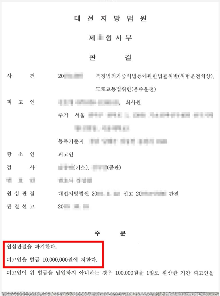 음주운전 사건의 경우 원심의 양형을 변경하지 않고 항소를 기각하는 경우가 많은데, 항소심은 다행히 변호인의 의견을 적극 고려하여 원심을 파기하고 의뢰인에게 벌금형을 선고하여 주었습니다.