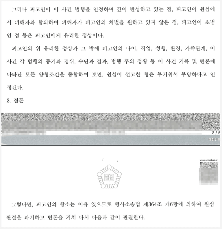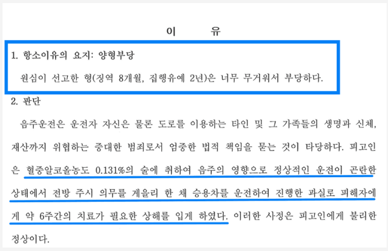 대법원은 “제1심과 비교하여 양형의 조건에 변화가 없고 제1심의 양형이 재량의 합리적인 범위를 벗어나지 아니하는 경우에는 이를 존중함이 타당하며, 제1심의 형량이 재량의 합리적인 범위 내에 속함에도 항소심의 견해와 다소 다르다는 이유만으로 제1심판결을 파기하여 제1심과 별로 차이 없는 형을 선고하는 것은 자제함이 바람직하다(대법원 2015. 7. 23. 선고 2015도3260 전원합의체 판결 등).”고 하여 항소심에서 원심이 선고한 형을 쉽게 변경하면 안 된다는 입장이고, 특히 이 사건에서는 의뢰인의 음주 수치가 높았고 피해자가 응급실에 실려 갈 만큼 큰 부상을 입었기 때문에 의뢰인이 벌금형으로 감형을 받기는 쉽지 않았습니다.