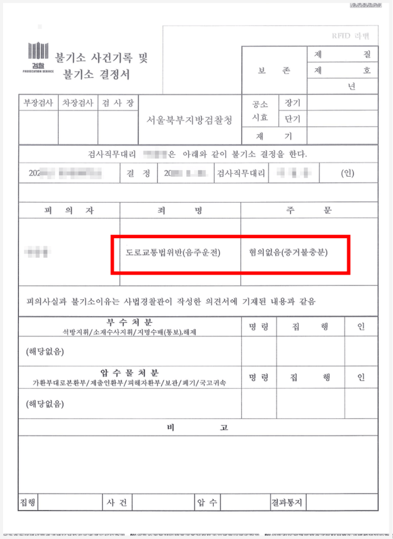 이에 변호인은 사건 당시 겁을 먹은 의뢰인이 자신이 운전을 하였다고 인정하였으나 의뢰인의 행적을 볼 때 그와 같은 진술이 객관적인 사실에 반하는 것이라는 점을 보여주고, 경찰관의 오해로 인하여 단속이 된 것이므로 의뢰인에게 혐의없음 처분이 이루어져야 한다는 점을 증거를 통하여 논리적으로 증명하였습니다.