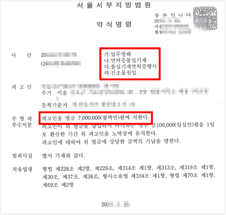 의뢰인에게 적용된 혐의는 건조물침입(형법 제319조), 업무방해(형법 제314조 제1항), 면허증불실기재 및 행사(형법 제228조 제2항, 제229조)의 네 가지였고, 증거가 명백하였으므로 적용되는 모든 혐의에 대해서 유죄를 피할 수 없는 상황이었습니다. 이 경우 의뢰인에게 다른 전과는 없었기 때문에 징역형의 실형이 선고될 가능성은 높지 않았으나 집행유예의 처벌을 받을 가능성이 높았습니다.