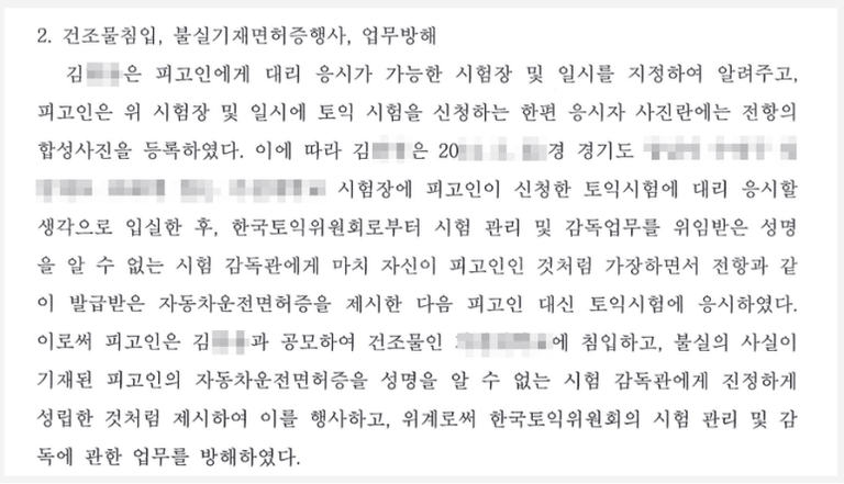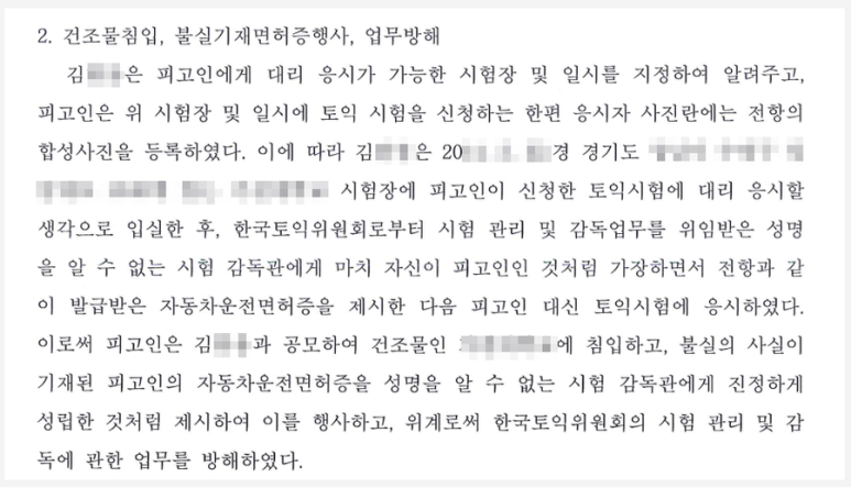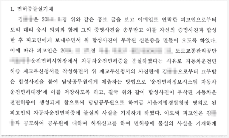 의뢰인은 K에게 자신의 사진을 보내주고, 그가 의뢰인과 자신의 얼굴을 합성한 사진을 만들어 보내주자 이를 이용하여 운전면허증을 재발급 받아 이를 다시 K에게 넘겨주었습니다. K는 이와 같이 부정하게 발급받은 운전면허증을 이용하여 의뢰인을 대신하여 토익 스피킹 시험에 응시하였습니다.