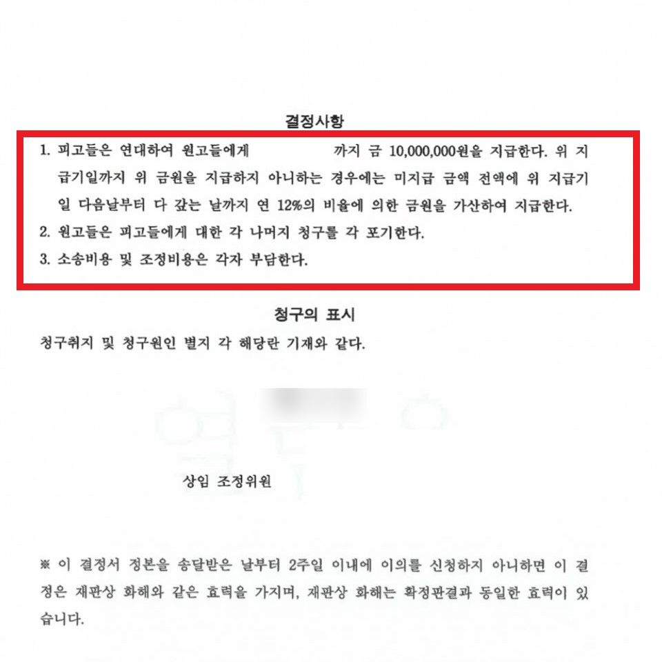 법원은 강제조정을 통해 1,000만 원을 인용하였습니다.