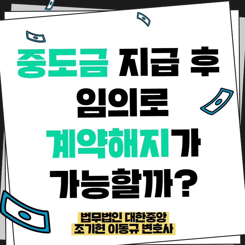 만약 중도금을 납부하고도 계약의 해지를 원하신다면 계약서의 체결 내용이 강행규정에 위반되거나 계약 체결과정에서 사기, 강박 등의 행위는 없었는 지 이에 대한 전문가의 법률적 조력을 받아 검토할 필요가 있습니다.