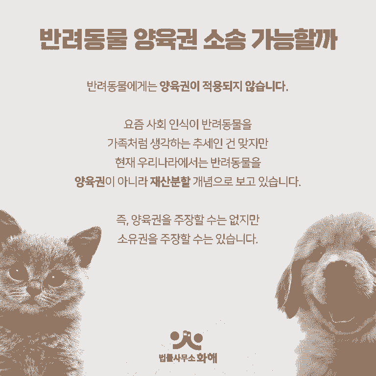 요즘 사회 인식이 반려동물을 가족처럼 생각하는 추세인 건 맞지만 현재 우리나라에서는 반려동물을 ‘양육권’이 아니라 ‘재산분할’ 개념으로 보고 있습니다. 즉, 양육권을 주장할 수는 없지만 소유권을 주장할 수는 있습니다.