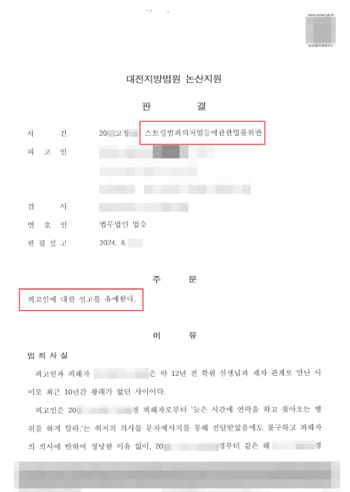 이번에 소개해드릴 사건은 스토킹범죄에 대해 약식벌금을 받은 의뢰인 사안을 도와 정식재판청구를 하여 선고유예 판결을 받아낸 사건 내용입니다.