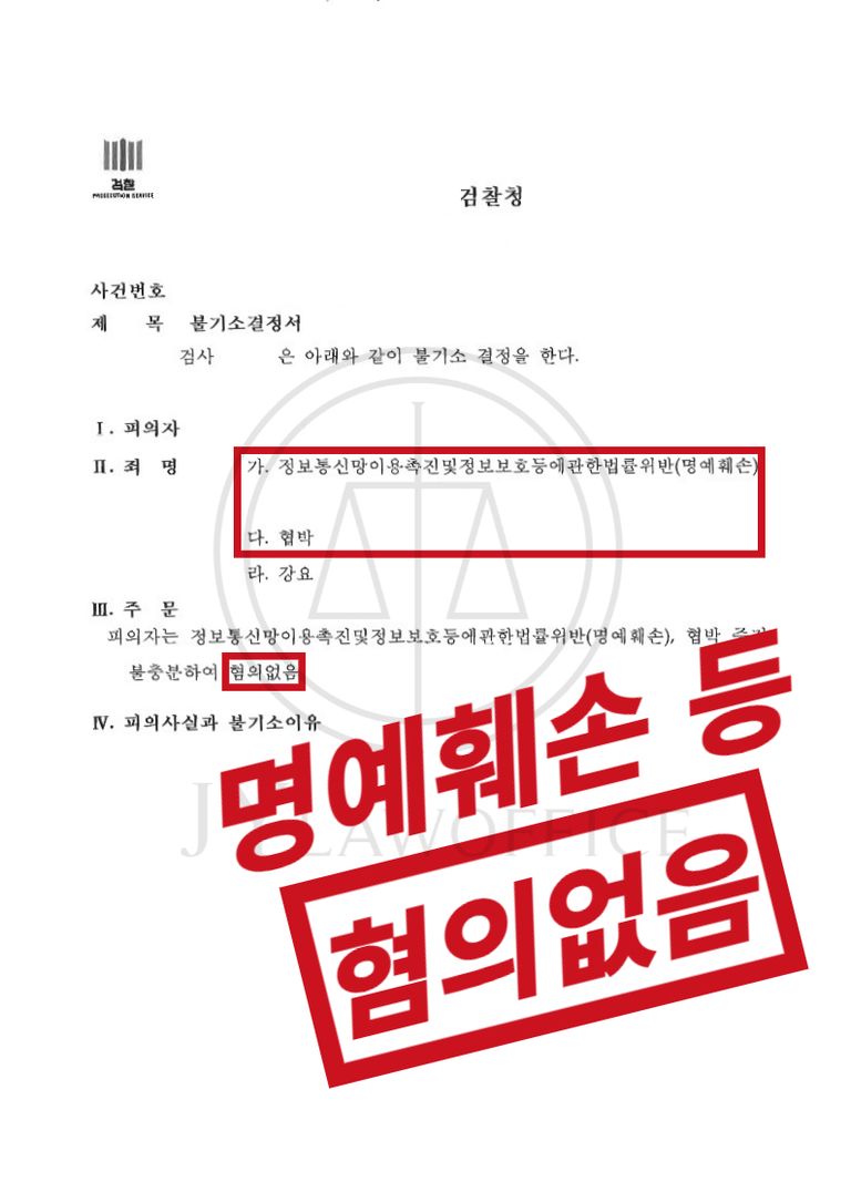 이와 같은 변호인의 조력에 의뢰인은 검찰단계에서 명예훼손 및 협박에 대하여 혐의없음 처분을 받고 수사단계에서 사건을 종결시킬 수 있었습니다.