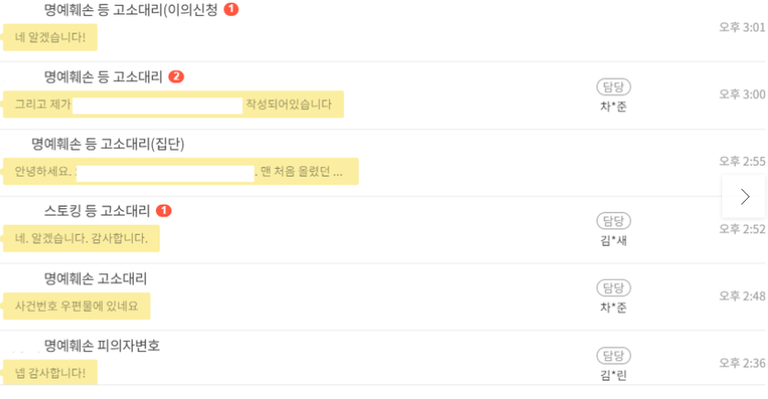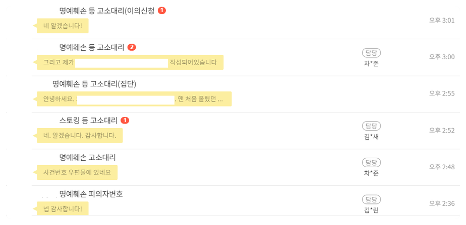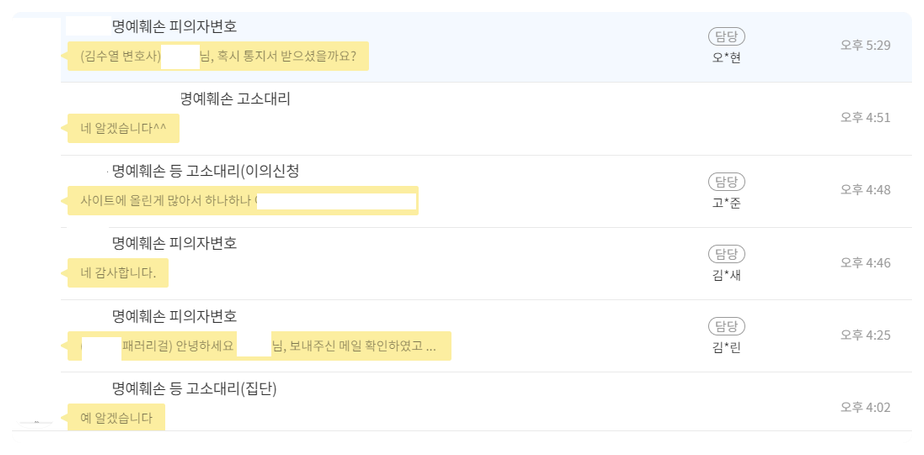 각 변호사가 해당 사건 담당하며 소통을 진행하고 있는 목록입니다. : )