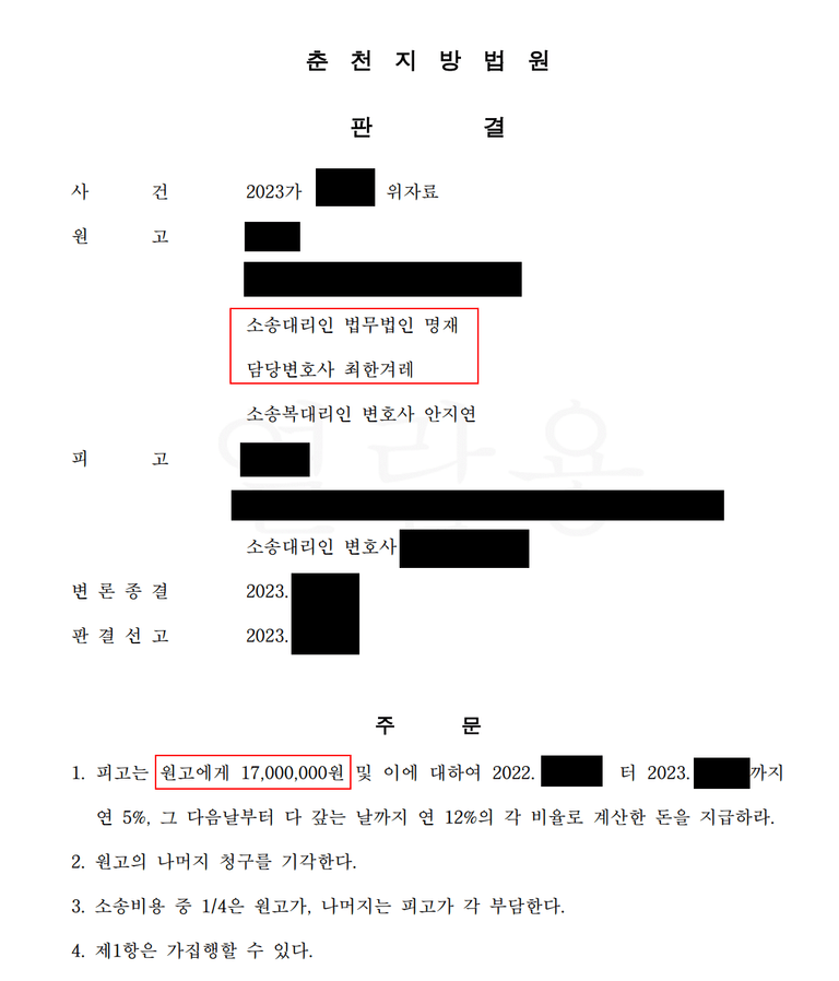 판결에 앞서 화해권고결정으로 위자료 1,700만 원이 나왔는데 피고는 이에 불복하여 이의하면서 판결선고합니다.