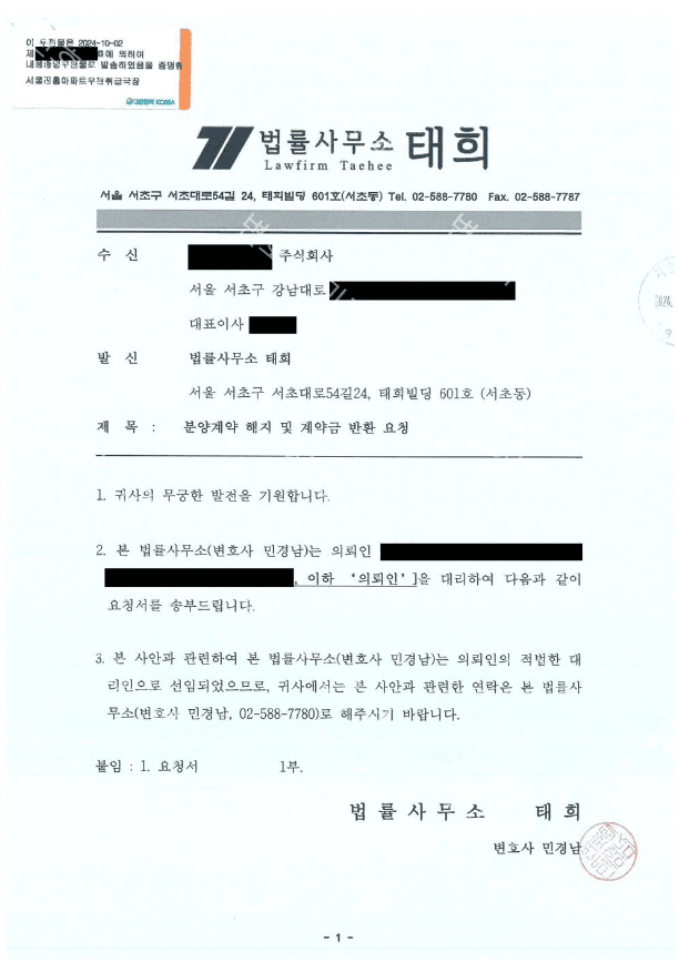 다만, 대부분 대행사나 시행사가 내용증명을 보내면 계약금을 돌려준다고 생각하시면 절대 안됩니다. 대부분의 대행사나 시행사는 계약을 강행하기 위해서 방문판매법에 따른 철회를 인정하지 않는 경우가 많고 소송까지 가는 경우가 매우 빈번하므로 소송까지 간다고 생각하고 내용증명 발송 단계에서부터 철저히 준비하셔야 할 것입니다.