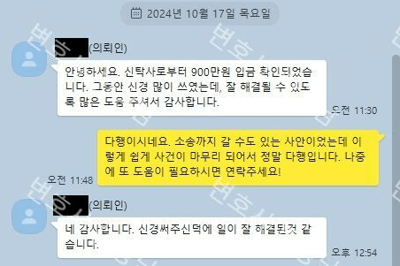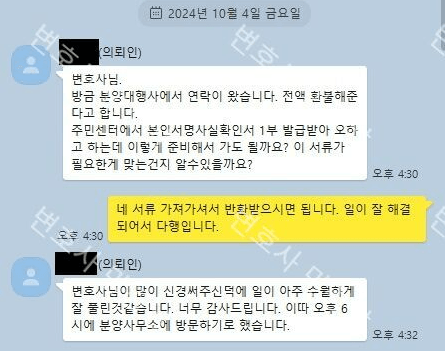 내용증명을 2024. 10. 2.에 발송하였고, 다음날 도착을 하였으며, 2024. 10. 4.에 상대방 시행사에서는 900만원을 최대한 빨리 돌려주겠다는 의사를 통보하였습니다. 내용증명을 발송였으나 상대방이 이를 돌려주지 않을까 의뢰인이 많이 걱정을 많이 하셨으나 다행이 크지 않은 비용으로 자신의 900만원을 모두 돌려 받을 수 있어서 매우 만족해 하셨고, 소송까지 가지 않고 사건을 쉽게 마무리 할 수 있었습니다.