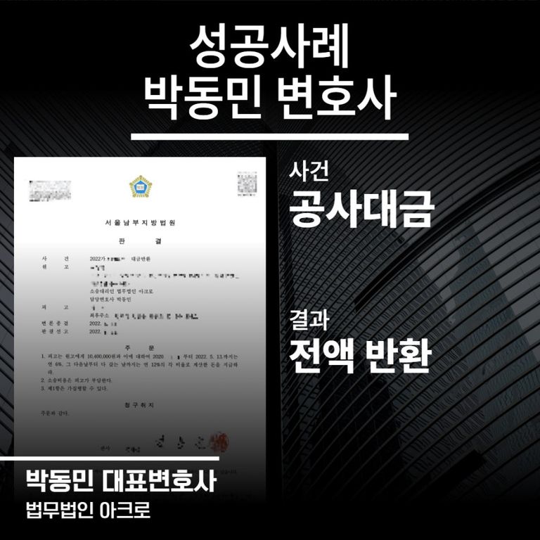 그러므로 공사대금과 관련하여 분쟁이 발생하였다면, 좋은 결과를 얻기 위해서라도 성공사례와 감사 후기로 실력이 보장된 “건설 전문 박동민 변호사”에게 상담을 요청하셔서 법적인 조력을 받으시길 바랍니다.