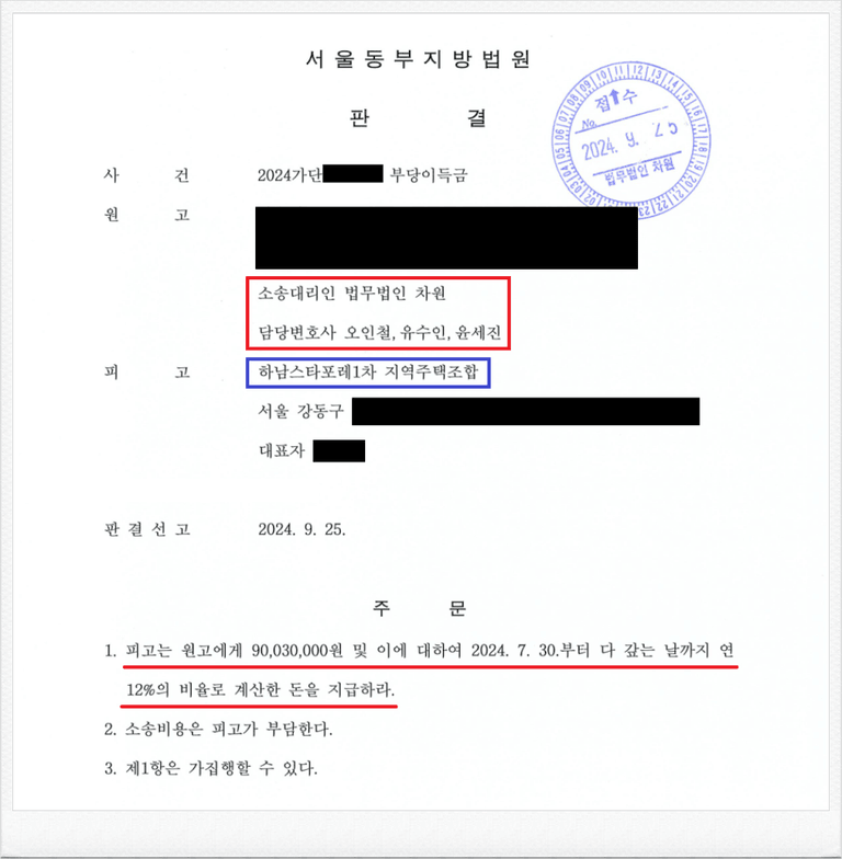 그러나, 가입 후 피고 하남스타포레1차 지역주택조합 측이 진행하는 사업이 계획한 대로 진행되지 않았고, 이에 의뢰인은 정식 민사소송을 통하여 기 납입한 금원의 반환을 원하셨습니다.