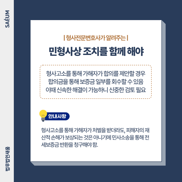 특히, 형사고소를 통해 가해자가 합의를 제안할 경우, 합의금을 받아 민사소송 절차를 생략할 수도 있습니다. 합의금을 통해 피해자의 보증금을 일부라도 회수할 수 있다면, 신속한 해결이 가능하기 때문에, 이러한 절차를 신중히 검토하는 것이 필요합니다.