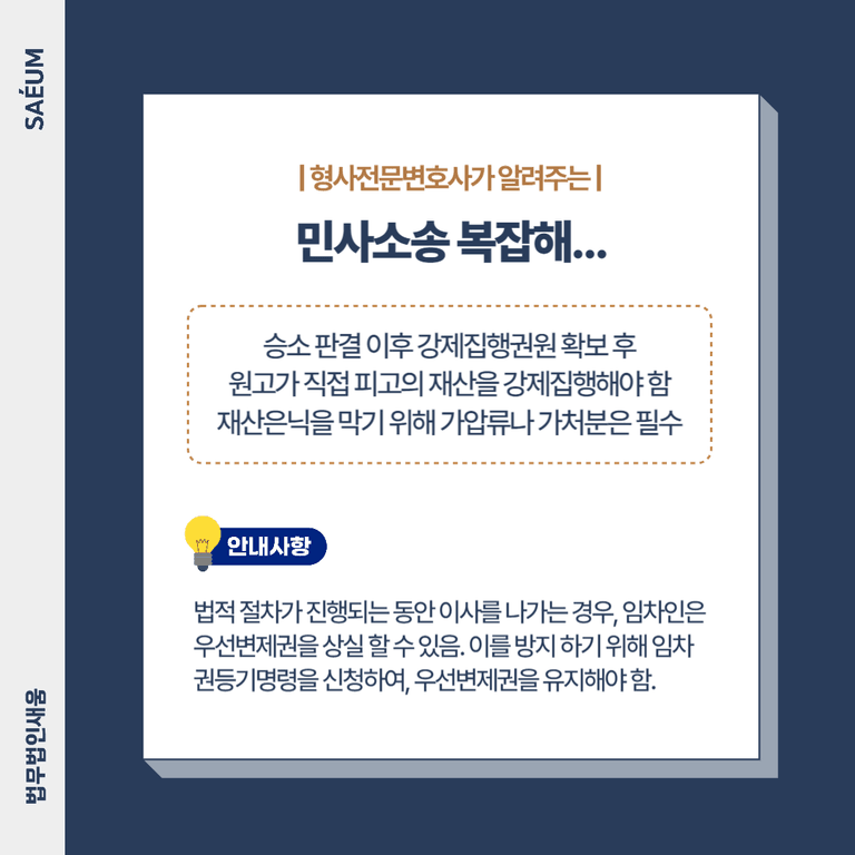 민사소송에서 승소한다고 해도, 법원이 자동으로 보증금을 돌려주는 것은 아닙니다. 승소 판결을 통해 강제집행권원을 확보한 후, 원고가 직접 피고의 재산을 강제집행하여 손해금을 회수해야 합니다. 이 과정에서 피고가 재산을 숨기거나 처분할 수 있기 때문에, 가압류나 가처분 절차가 필수적입니다.