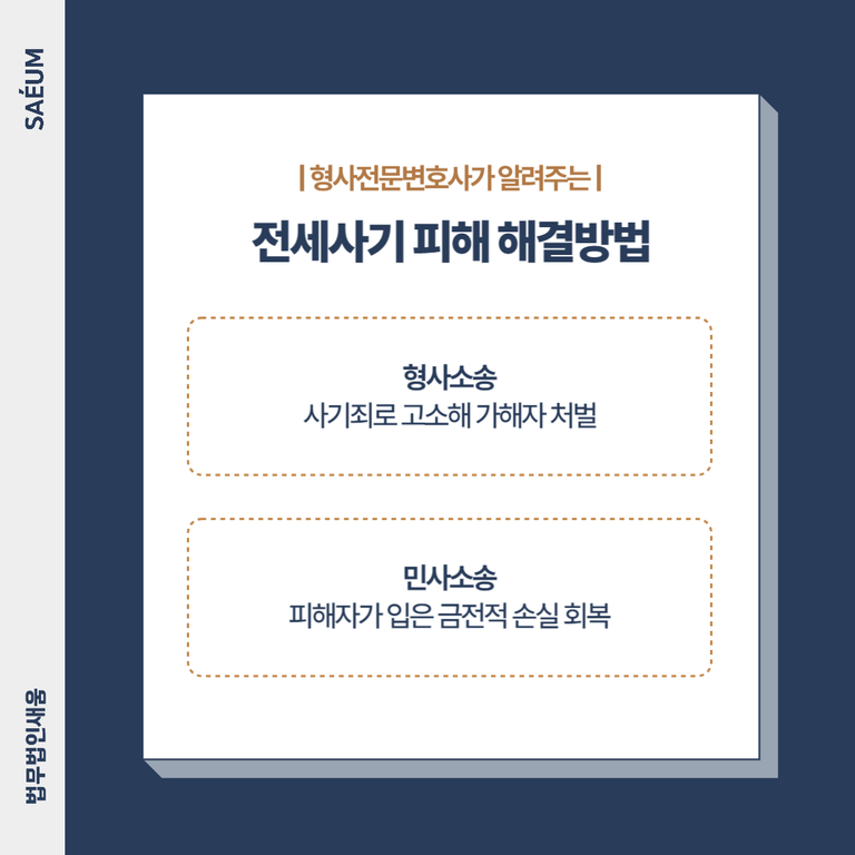 전세사기 피해를 완전히 해결하기 위해서는 형사소송과 민사소송을 함께 준비해야 합니다. 형사고소를 통해 가해자가 처벌을 받는다고 해도, 피해자의 재산적 손해가 보상되는 것은 아니기 때문에, 민사 절차를 통해 전세보증금 반환을 청구해야 합니다.